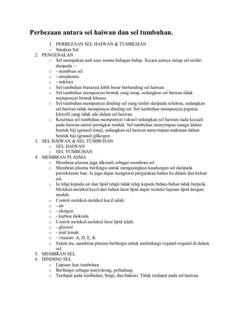 Dalam hal ini, tumbuhan memiliki dinding sel sedangkan hewan tidak. Vakuola dapat mengasingkan bahan yang mungkin membahayakan sel. Dinding sel, merupakan penyusun sel. .tumbuhan sel tumbuhan sel haiwan dinding sel beri sokongan,perlindungan dan bentuk kepada sel membran sel mengawal pergerakan bahan ke dalam dan ke luar sel kloroplas beri sokongan,perlindungan dan bentuk kepada sel. Selain dua hal di atas, kedua sel ini juga mengandung struktur sel bernama organel yang berperan khusus. Plastida adalah hasil perkembangan dari badan kecil (plosplastida). Vakuola adalah petak dalam sel yang dipenuhi dengan air. Oleh sebab saiz sel yang sangat kecil, jadi sel hanya boleh dilihat dengan menggunakan mikroskop. Sel tumbuhan mempunyai dinding sel yang kaku dan mengelilingi membran sel. Hewan dan tumbuhan ialah 2 jenis klasifikasi makhluk hidup yang sering kita jumpai di sekitar kita. Sel dibedakan menjadi sel eukariotik dan sel prokariotik. Misalnya di dalam sel tumbuhan yang sedang berbunga tidak ditemukan. Namun pada tahap tertentu saat terjadi pembelahan antara sel hewan dan sel tumbuhan terdapat sedikit perbedaan.