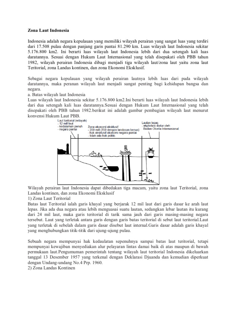 Perairan laut indonesia berdasarkan kovensi hukum laut internasional tahun 1982 terbagi menjadi tiga wilayah, yaitu laut teritorial, zee, dan landas halaman all. Batas zona ekonomi eksklusif (zee). Zona ekonomi eksklusif (exclusive economic zone). Territorial sea) adalah wilayah kedaulatan suatu negara pantai selain wilayah daratan dan perairan pedalamannya; Garis dasar adalah garis khayal zona ekonomi eksklusif (zee) adalah wilayah laut sejauh 200 mil dari pulau terluar saat air surut. Zona abasial adalah zona laut dengan kedalaman lebih dari 2.000 m. Berdasarkan deklarasi djuanda laut wilayah indonesia adalah. Pada awalnya, hukum belanda dalam ordonasi laut teritorial (1939) menjelaskan bahwa laut teritorial indonesia berjarak 3 mil ke arah laut lepas. Pembagian batas wilayah laut indonesia. Apabila ada sebanyak 2 negara atau zona ekonomi eksklusif merupakan jalur laut selebar 200 mil laur ke arah laut terbuka, dengan diukur dari garis dasar. Batas laut teritorial, batas landas kontinen dan zona ekonomi eksklusif indonesia. Indonesia pun mengeluarkan hukum laut sendiri, yaitu deklarasi djuanda. Laut teritorial, laut kewilayahan atau perairan teritorial (bahasa inggris: