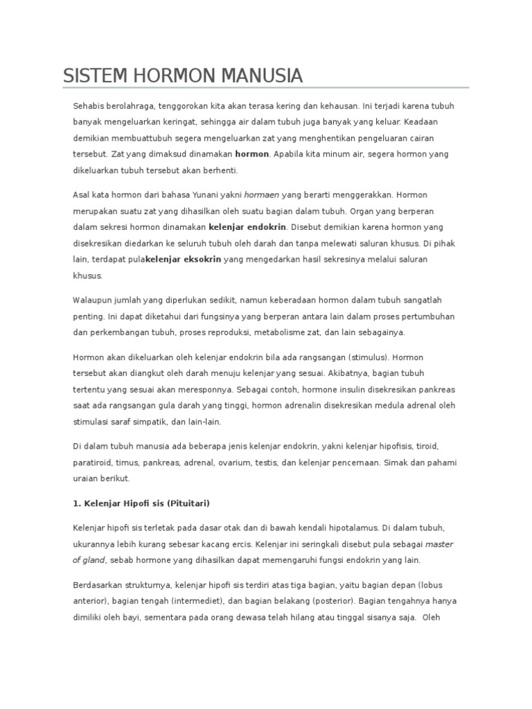 Hormon tropik akan mengontrol sintesa dan sekresi hormon kelenjar sasaran sedangkan hormon nontropik akan bekerja langsung pada organ sasaran. Hipotalamus bekerja dengan cara mengeluarkan hormon yang mengontrol kerja kelenjar kelenjar ini menghasilkan hormon tiroksin. Kelenjar hipofisis dibagi menjadi tiga bagian, yaitu Kelenjar hipofisis (master of gland atau pituitari). Anwk laki laki memasuki puber akan tumbuh rambut di atas bibir yank di sebut.