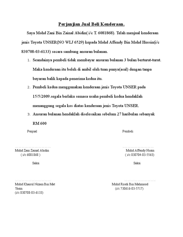 Surat perjanjian jual beli mobil. Surat ini bersifat penting karena saat kita telah membeli sesuatu menjadi sebuah bukti yang sah di mata hukum. Transaksi jual beli mobil bekas sudah merupakan hal yang umum kita temui. Yang bertanda tangan dibawah ini : Berikut ini adalah contoh surat perjanjian jual beli terutama kapal, contoh ini sudah disesuaikan dengan materi sma kelas 2full description.